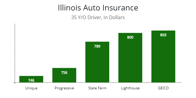 Note: For a 35-year-old driver in Illinois, all 5 insurers illustrated are competitive choices. Each clustered around the $750 to $800 range. A family of 4 would find cheaper quotes by comparing Unique and Progressive.